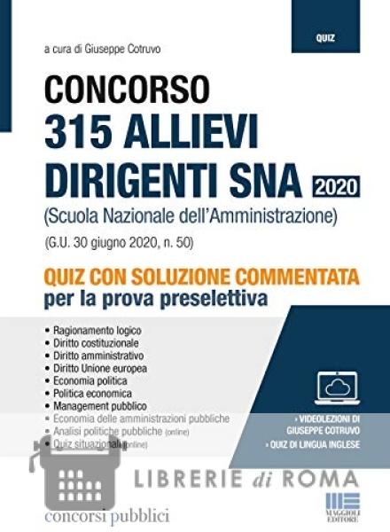 Il volume è una raccolta di quiz a soluzione commentata per la preparazione alla prova preselettiva concorso per l'ammissione di 315 allievi al corso-concorso selettivo di formazione dirigenziale per il reclutamento di 210 dirigenti nelle amministrazioni statali, pubblicato sulla Gazzetta ufficiale del 30 giugno 20202 n. 50. Il testo si divide in 2 parti. La prima parte presenta una selezione di prove ufficiali assegnate nei concorsi degli ultimi 2 anni. Le prove raccolgono quiz delle seguenti tipologie: ragionamento astratto; comprensione verbale; ragionamento verbale; ragionamento critico verbale; logica deduttiva; problem solving; ragionamento numerico; ragionamento numerico deduttivo; ragionamento critico numerico. All'interno delle prove ufficiali sono presenti anche quiz di altre materie di cui sono fornite le risposte esatte. Ad ogni quiz di logica di tutte le prove è collegata una videolezione di Giuseppe Cotruvo con la spiegazione della giusta tecnica di risoluzione. Tutte le videolezioni (circa 800) sono disponibili nella sezione online, raggiungibile seguendo le istruzioni riportate in fondo al libro. La seconda parte raccoglie una selezione di quiz a risposta multipla con soluzione commentata delle materie giuridiche ed economiche oggetto delle prove, ovvero: Diritto costituzionale; Diritto amministrativo; Diritto Unione europea; Economia politica; Politica economica; Management pubblico; Economia delle amministrazioni pubbliche. Nella sezione online collegata al volume, disponibile su www.maggiolieditore.it seguendo le istruzioni riportate in fondo al testo, sono disponibili: selezione di quiz relativi all'Analisi delle politiche pubbliche; quiz di lingua inglese; quiz situazionali.