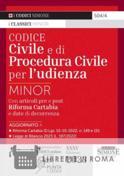 Questa edizione del Codice Civile e di Procedura civile per l'udienza Minor è stata completamente rinnovata e aggiornata ai decreti attuativi della cd. Riforma Cartabia nell'ambito civilistico (D.Lgs. 10-10-2022, n. 149 e n. 151) nonché alla Legge di bilancio 2023 (L. 197/2022) che ne ha anticipato l'applicabilità al 28 febbraio 2023 ma solo per i procedimenti instaurati successivamente a tale data. Numerose sono però le eccezioni a questa data e il regime transitorio delle date di decorrenza rimane particolarmente complesso. Per questo motivo, dovendosi applicare in futuro ancora in molti casi la disciplina previgente, in questo Codice: per ogni articolo modificato dalla Riforma Cartabia sono stati riportati entrambi i testi dell'articolato pre e post Riforma; le modifiche della Riforma Cartabia sono evidenziate in neretto nel testo dell'articolo così da essere immediatamente riconoscibili; in nota ad ogni articolo riformato è riportata la data di decorrenza della sua applicazione. Un dettagliato indice analitico-alfabetico e un puntuale indice cronologico chiudono, infine, il Codice consentendo un facile reperimento delle norme. Attraverso un QrCode «PUNTA e LEGGI» sarà possibile anche accedere agli aggiornamenti normativi online.