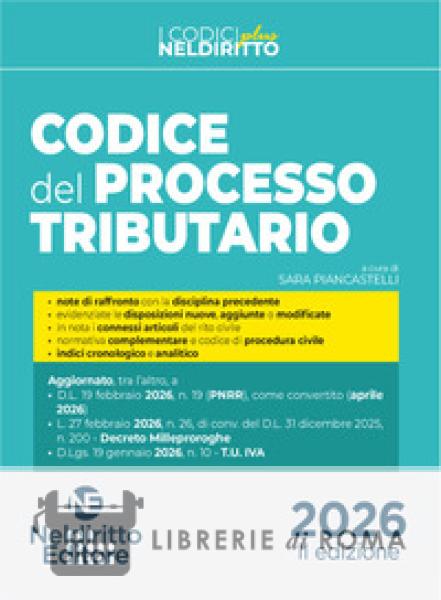 Il Codice del processo tributario, Nel Diritto Editore, 2026 consente di cogliere in modo assai intuitivo le rilevanti novità intervenute a modificare la disciplina processuale. In particolare: sono evidenziate le disposizioni del tutto nuove (perché non presenti nella precedente disciplina), nonché quelle aggiunte o modificate; sono riportate in nota le disposizioni della disciplina precedente per consentire visivamente il raffronto con le novità; sono indicati in nota i connessi articoli del rito civile. Quanto alla struttura, il Codice è articolato in tre Parti: la prima recante le disposizioni generali tra cui i D.Lgs. nn. 545 e 546 del 1992, così come il D.M. 24 novembre 2025 (regole tecnico-operative relative all'udienza da remoto), il nuovo Testo unico della giustizia tributaria (D.Lgs. 14 novembre 2025, n. 175 che si applicherà dal 1° gennaio 2027) e lo Statuto del contribuente, come modificato dal D.Lgs. 18 dicembre 2025, n. 192 (c.d. Decreto Correttivo); la seconda nella quale è inserita una ricca raccolta di norme complementari; la terza contenente il codice di procedura civile e le relative disposizioni di attuazione, utilissimi per gli operatori del processo tributario, attesi i numerosi rinvii che la disciplina processuale di settore fa alle norme del rito civile. Inoltre, il Codice è aggiornato ai più recenti interventi normativi, tra cui si segnalano quanto all'anno in corso: D.L. 19 febbraio 2026, n. 19 (PNRR), come convertito (aprile 2026); L. 27 febbraio 2026, n. 26, di conv. del D.L. 31 dicembre 2025, n. 200 - Decreto Milleproroghe; D.Lgs. 19 gennaio 2026, n. 10 - Testo unico delle disposizioni legislative in materia di imposta sul valore aggiunto. Completano il Volume l'Indice cronologico e un corposo Indice analitico, contenente numerose voci direttamente riguardanti il processo tributario.