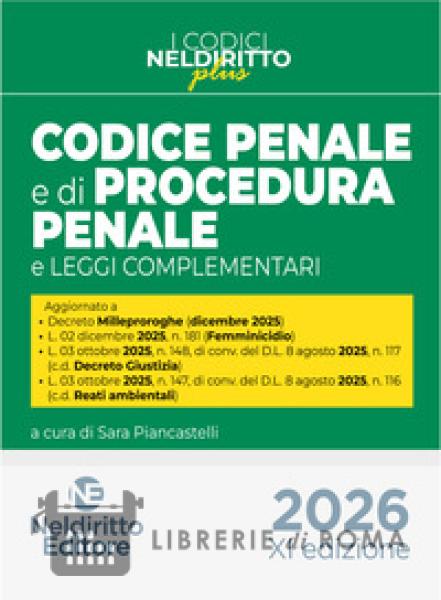 Il Codice penale e di procedura penale, Neldiritto Editore, 2026 rivolto a avvocati, magistrati, studiosi, consente di disporre della più importante normativa penale sostanziale, processuale e complementare. Il Volume contiene - oltre alla Costituzione, alle Fonti Internazionali ed Europee - il Codice penale e le relative Disposizioni di coordinamento e transitorie ; il Codice di procedura penale e le Disposizioni di attuazione; una ragionata selezione di leggi complementari sostanziali e processuali articolate in apposite voci tematiche. In questa XI edizione, il Codice tiene conto delle più recenti novità legislative , tra cui si segnalano: Decreto Milleproroghe (dicembre 2025); L.02 dicembre2025, n. 181 (Femminicidio); L. 03 ottobre2025, n. 148, di conv. del D.L. 8 agosto2025, n. 117 (c.d. Decreto Giustizia); L. 03 ottobre2025, n. 147, di conv. del D.L. 8 agosto2025, n. 116 (Reati ambientali). Unico per completezza e dovizia e di grandissima utilità per professionisti e studenti è l'apparato di Guide normative sotto ciascuna norma incriminatrice del Codice penale. Quanto agli Istituti processuali, forniscono indicazioni dettagliate in tema, tra l'altro, di competenza, arresto, misure di prevenzione, intercettazioni, procedibilità, riti. Per gli Istituti sostanziali, invece, prendono in considerazione la prescrizione, la responsabilità exd.lgs.n. 231, la messa alla prova, i benefici penitenziari e tanti altri aspetti. Completano l'Opera l'Indice cronologico e un corposo Indice analitico.