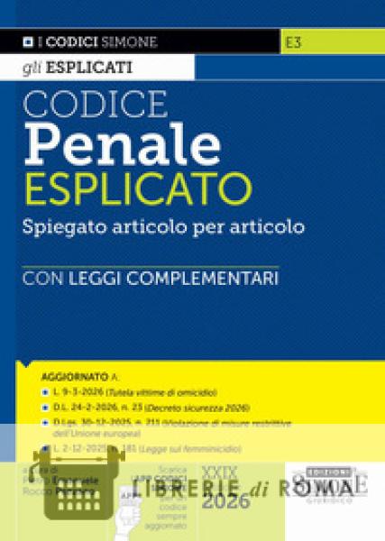 La XXIX edizione del Codice Penale Esplicato presenta l'originale struttura e impianto grafico che caratterizzano i nuovi Esplicati Simone. Come tutti i Codici della collana Esplicati, al fine di agevolare lo studio e la comprensione del testo legislativo, sono stati previsti alcuni accorgimenti didattici: caratteri chiari e leggibili, per una lettura più agevole; definizioni delle parole chiave in neretto, per facilitare la comprensione degli articoli; istituti sostanziali e processuali, con l'indicazione per ogni delitto della natura giuridica, dell'elemento soggettivo, della configurabilità del tentativo, dell'Autorità competente, del regime di procedibilità, dell'applicabilità del fermo e dell'arresto; note esplicative, che completano l'analisi del testo normativo; collegamenti essenziali e rinvii ad altre definizioni, articoli e leggi speciali; riquadri di approfondimento su fondo grigio, per spiegare la ratio delle disposizioni; riferimenti giurisprudenziali, per collegare la norma alla sua applicazione concreta attraverso esempi pratici o riferimenti a casi giuridici; leggi complementari, poste in Appendice e corredate da una breve introduzione, per avere un quadro normativo completo su argomenti strettamente connessi al diritto penale; indice analitico, per facilitare la ricerca e la comprensione delle norme. Per come strutturati, dunque, i Codici esplicati sono fondamentali per: studenti universitari, per lo studio del diritto e la preparazione agli esami; coloro che devono preparare un concorso con prove a quiz dove spesso è oggetto di test proprio il dato normativo contenuto nel codice; professionisti del diritto, per una consultazione rapida e un'applicazione pratica delle norme. Per assicurare un contenuto sempre attuale, il Codice Penale Esplicato è aggiornato alle più recenti novità normative e giurisprudenziali, fra cui si segnalano la L. 9-3-2026 (Tutela spoglie mortali vittime di omicidio), il D.L. 24-2-2026, n. 23 (Decreto sicurezza 2026), il D.Lgs. 30-12-2025, n. 211 (Violazione di misure restrittive dell'Unione europea) e la L. 2-12-2025, n. 181 (Legge sul femminicidio). L'App CodiciSimone, disponibile gratuitamente sia per iOS e Android, permette di consultare il codice dallo smartphone e averlo sempre aggiornato in tempo reale.