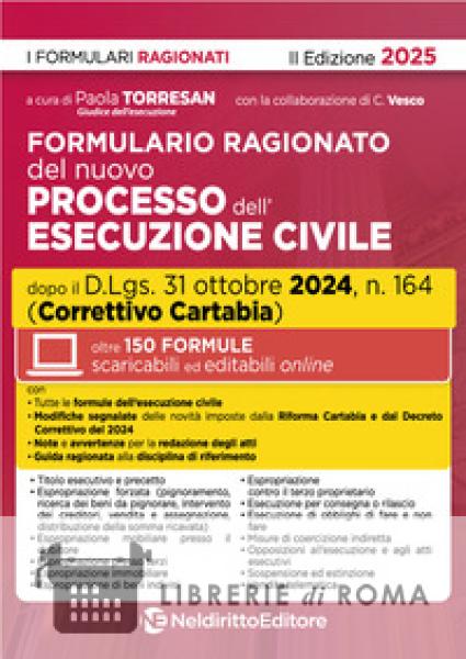 Il Formulario ragionato del Nuovo processo dell'esecuzione civile dopo il Correttivo Cartabia, Nel Diritto, è diretto a soddisfare un'esigenza molto forte nei professionisti, alle prese con una non semplice applicazione delle novità introdotte dalla Riforma Cartabia del 2022 e dal Decreto Correttivo Cartabia del 2024.L'estrema utilità dell'Opera è dovuta alla originalità della struttura e all'ampiezza del perimetro. Quanto alla struttura, per ciascuna formula sono: segnalate con apposita evidenziazione le novità che, la Riforma Cartabia e il Decreto Correttivo 2024impongono di introdurre o considerare; indicate, in un articolato apparato di note, le avvertenze di cui tener conto in sede di redazione. Si tratta di indicazioni autoriali, accorgimenti grafici e tecniche redazionali che rendono il Formulario di intuitiva lettura ed utilizzazione. Le formule sono inoltre accompagnate da un articolato sistema di Inquadramenti, diretti ad illustrare il contesto processuale al cui interno gli atti processuali si inseriscono, con una particolare attenzione alle innovazioni apportate dal Decreto Correttivo Cartabia del 2024 al sistema processuale di riferimento. Quanto al perimetro, il Formulario è organizzato seguendo la struttura del sistema processuale e ricomprende pressocché tutti gli atti del procedimento di esecuzione, riguardanti in particolare: il titolo esecutivo e il precetto, l'espropriazione forzata (pignoramento, ricerca dei beni da pignorare, intervento dei creditori, vendita e assegnazione, distribuzione della somma ricavata), l'espropriazione mobiliare presso il debitore, l'espropriazione presso terzi, l'espropriazione immobiliare, l'espropriazione di beni indivisi, l'espropriazione contro il terzo proprietario, l'esecuzione per consegna o rilascio, l'esecuzione di obblighi di fare e non fare, le misure di coercizione indiretta, le opposizioni all'esecuzione e agli atti esecutivi, la sospensione ed estinzione. Completano il volume le formule riguardanti la vendita telematica.Raccoglie150 formule scaricabili e rieditabili.