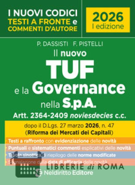 I volumi della Collana I nuovi Codici con testi a fronte, Nel diritto Editore, consentono di visualizzare in modo immediato tutte le novità che hanno interessato i settori normativi più importanti e di coglierne ratio, contenuti, primi orientamenti interpretativi che sulle stesse sono emersi in giurisprudenza. Costituiscono, pertanto, uno strumento utilissimo di aggiornamento mirato per i professionisti, per le Amministrazioni o per chi deve prepararsi ad affrontare prove selettive. Con una tecnica redazionale innovativa ed efficace, riportano sotto ciascuna disposizione interessata da modifiche normative: i testi a raffronto con evidenziazione delle novità apportate e delle relative fonti; puntuali e sistematici commenti esplicativi delle riforme; illustrazioni articolate della giurisprudenza intervenuta ad applicare le modifiche segnalate; raccolta delle sentenze commentate nel Volume in apposita Appendice online; tavola sinottica, recante un riepilogo di tutte le disposizioni modificate, utilissima per avere immediata contezza complessiva delle novelle riportate nel volume. Il Volume Il nuovo TUF e la Governance della S.p.A. Artt. 2364-2409 novies decies c.c., con testi a fronte e commenti esplicativi, 2026, Nel diritto Editore, rivolto a avvocati, magistrati, studiosi e operatori del settore, consente di visualizzare in modo chiaro e immediato tutte le novità introdotte dal Decreto di Riforma del Mercato dei Capitali (aprile 2026). Il Codice è articolato in tre Parti. La prima reca per intero il Testo unico delle disposizioni in materia di intermediazione finanziaria, di cui al D.Lgs. 24 febbraio 1998, n. 58. La seconda contiene, invece, le modifiche recate al Codice civile e alle relative disposizioni di attuazione. La terza parte, infine, contiene una selezione delle principali Leggi complementari collegate come modificate dalla Riforma. Completa il Volume un puntuale Indice analitico.