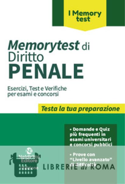 Chi studia per gli esami universitari o per i concorsi pubblici ha un bisogno "vitale" di saggiare l'andamento dello studio e di verificare se sta dando i risultati auspicati. Questi strumenti di verifica mancano ed è invece "molto opportuno" avere tempestiva contezza di come la preparazione procede! Con la Collana Memorytest è possibile allora affiancare alla preparazione teorica una corrispondente verifica. In questa prospettiva, i volumi Memorytest sono diretti a stimolare il candidato nel fissare e memorizzare nozioni e concetti chiave, nonché nel collegare, cogliere e comprendere istituti e discipline. Come sono organizzati i Memorytest? Assai innovativa è la struttura dei Memorytest articolati nelle seguenti sei Sezioni: 1. Vero o falso; Quiz a scelta multipla; 3. Domande di esame; 4. Cerca l'errore; 5. Correlazioni (utilissime per saggiare la capacità di collegare le nozioni acquisite); 6. Caso da risolvere (utile per impossessarsi di istituti e discipline, facendone concreta applicazione). Nel costruire gli esercizi si è tenuto anche conto delle domande formulate nei più diffusi concorsi pubblici, nonché dei quiz più frequentemente somministrati nei concorsi con prova preselettiva. Come i Memorytest accompagnano una preparazione graduale e progressiva? Nel percorso di preparazione l'acquisizione compiuta delle conoscenze ha luogo in modo graduale. A tal fine, nei Memorytest, per ciascuna delle prime quattro indicate Sezioni ("Vero o falso", "Quiz a scelta multipla", "Domande di esame", "Cerca l'errore"), dopo gli esercizi di livello base, ne sono somministrati taluni con un livello più intenso di difficoltà, indicati con l'acronimo "LA" (id est, Livello avanzato). Sono, inoltre, indicati i capitoli e paragrafi dei corrispondenti volumi "Dispense d'Autore" e "Compendi d'Autore", nei quali le questioni sono trattate.