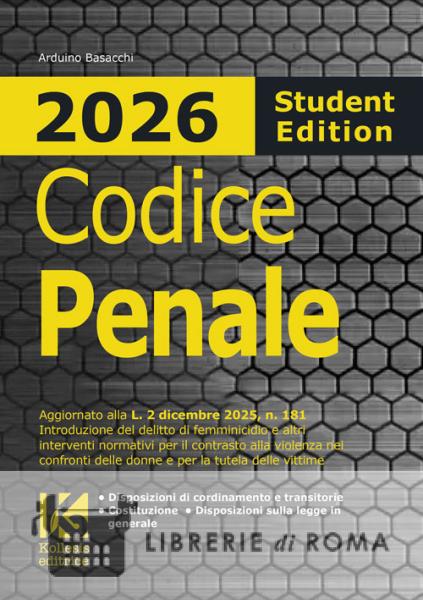 Il codice penale 2026 Student Edition Kollesis è essenziale, maneggevole, di facile e rapida consultazione, e ad alta leggibilità grazie al carattere tipografico ulteriormente maggiorato. Un libro da tenere sempre con sé per ripassare, memorizzare e rileggere agevolmente le norme del diritto penale per studio o per lavoro. Al testo del codice penale seguono le rispettive disposizioni di coordinamento e transitorie, le preleggi, la Costituzione italiana. Aggiornato alla legge sul reato di "femminicidio", L. 2 dicembre 2025, n. 181, introduzione del delitto di femminicidio e altri interventi normativi per il contrasto alla violenza nei confronti delle donne e per la tutela delle vittime. Consultabile durante concorsi ed esami.