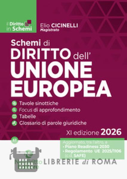La Collana "Il Diritto in Schemi" intende fornire un utile supporto per l'apprendimento e il ripasso delle principali discipline oggetto di esami e concorsi. Gli "Schemi" guidano lo studente e il concorsista nello studio delle materie, aiutandolo a focalizzare l'attenzione sulle nozioni fondamentali e sugli aspetti principali di disciplina di ogni argomento, sulle analogie e le differenze tra gli istituti, sui profili meritevoli di approfondimento perché oggetto di attenzione da parte della dottrina e della giurisprudenza. I volumi sono caratterizzati dalla schematizzazione degli argomenti, che rende possibile una chiara e immediata comprensione e un'agevole memorizzazione, ed in particolare contengono: schemi e tavole sinottiche; tabelle di comparazione tra istituti; focus di approfondimento; particolari accorgimenti grafici, quali l'uso di simboli, elenchi puntati e grassetti, per sviluppare la memoria visiva. Tali elementi rendono i volumi una guida pratica per chi vuole prepararsi alla materia partendo dalle nozioni di base e dagli istituti fondamentali o per chi necessita di un ripasso veloce nell'imminenza della prova, fungendo anche da utile strumento da affiancare a manuali e compendi. In questa XI edizione 2026 il Volume tiene conto del Piano Readiness 2030 e del Regolamento UE 2025/1106 istitutivo del c.d. SAFE. Ad arricchire il Volume è inserito, in chiusura, un Glossario di parole giuridiche, in cui sono inseriti istituti o principi non trascurabili nella preparazione, con la essenziale definizione.