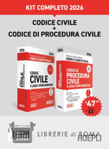 Il nuovo Kit completo 2026 contiene il Codice civile e il Codice di procedura civile in confezione unica e a un prezzo vantaggioso. Aggiornato ai recenti provvedimenti legislativi: L. 30 dic. 2025, n. 199: Legge di bilancio 2026 D.lgs. 18 dic. 2025, n. 192: Disposizioni in materia di imposta sulle successioni e donazioni e di imposta di registro D.M. 10 dic. 2025: Modifica del tasso degli interessi legali L. 2 dic. 2025, n. 182: Semplificazione e digitalizzazione dei procedimenti in materia di attività economiche e di servizi a favore dei cittadini e delle imprese L. 2 dic. 2025, n. 181: Introduzione del delitto di femminicidio e altri interventi normativi per il contrasto alla violenza nei confronti delle donne e per la tutela delle vittime D.lgs. 26 nov. 2025, n. 178: Disposizioni in materia di produzione di energia da fonti rinnovabili L. 3 ott. 2025, n. 148: Conversione del D.L. 8 ago. 2025, n. 117, recante misure urgenti in materia di giustizia L. 23 set. 2025, n. 132: Disposizioni e deleghe al Governo in materia di intelligenza artificiale L. 8 ago. 2025, n. 118: Conversione del D.L. 30 giu. 2025, n. 95, recante disposizioni urgenti per il finanziamento di attività economiche e imprese D.lgs. 1° ago. 2025, n. 123: Testo unico in materia di imposta di registro e di altri tributi indiretti D.lgs. 19 giu. 2025, n. 88: Disposizioni integrative e correttive al D.lgs. 2 mar. 2023, n. 19, in materia di trasformazioni, fusioni e scissioni transfrontaliere D.lgs. 12 giu. 2025, n. 81: Disposizioni integrative e correttive in materia di adempimenti tributari, concordato preventivo biennale, giustizia tributaria e sanzioni tributarie L. 9 giu. 2025, n. 80: Conversione del D.L. 11 apr. 2025, n. 48, recante disposizioni urgenti in materia di sicurezza pubblica.