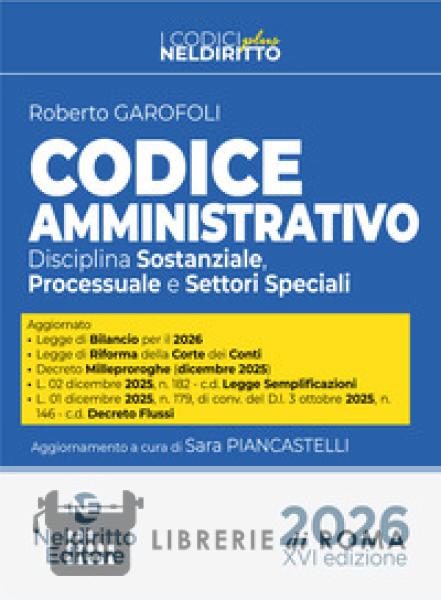 L'Edizione gennaio 2026 del Codice Amministrativo, NelDiritto Editore, tiene conto di tutte le più recenti novità normative, tra le tante si segnalano: Legge di Bilancio per il 2026; Legge di Riforma della Corte dei Conti; Decreto Milleproroghe (dicembre 2025); L. 02 dicembre2025, n. 182 - c.d. Legge Semplificazioni; L. 01 dicembre 2025, n. 179, di conv. del D.l. 3 ottobre 2025, n. 146 - c.d. Decreto Flussi; D.lgs. 27 novembre2025, n. 184 -Codice degli incentivi. Ad arricchire il Volume un'estensione online contenente gli Allegati, aggiornati, al Codice dei contratti pubblici non inseriti nel volume e le Direttive 2014/23/UE, 2014/24/UE e2014/25/UE del Parlamento europeo e del Consiglio, del 26 febbraio 2014, alle quali Codice e Allegati di frequente rinviano. Completa il Volume un corposo Indice analitico.