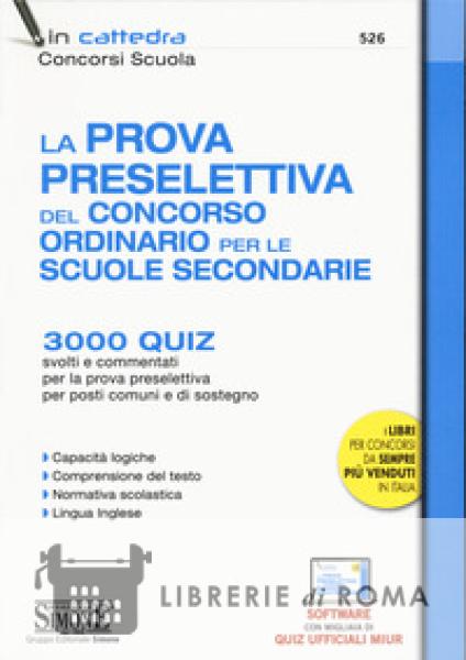 Il manuale costituisce uno strumento di studio per la preparazione alla prova preselettiva del Concorso Ordinario per la scuola secondaria di primo e secondo grado (posti comuni e di sostegno) che consiste in una prova computer based volta all'accertamento delle capacità logiche, di comprensione del testo, di conoscenza della normativa scolastica e della lingua Inglese (livello B2). Pertanto il testo include 3.000 quiz a scelta multipla, tutti svolti e commentati di Logica, Normativa scolastica e di Lingua Inglese. Al fine di agevolare ulteriormente l'approccio alla prova d'esame di coloro che non hanno mai partecipato a questo concorso, dei suddetti 3.000 quesiti oltre 1.500 sono quiz ufficiali tratti dalla banca-dati MIUR utilizzata nel Concorso del 2012. A questi sono stati aggiunti numerosi altri quiz - inediti o tratti da altre banche-dati ufficiali - atti a favorire la preparazione. La sezione di Logica comprende in particolare: le tipologie di quiz già somministrate nei precedenti concorsi, vale a dire: Significati di termini e modi di dire; Serie di termini; Termini e frasi da completare; Analogie verbali; Grammatica; Relazioni di ordine e grandezza; Comprensione di brani; Relazioni insiemistiche; Serie numeriche, alfabetiche e alfanumeriche; Aritmetica, algebra, problem solving; Equazioni simboliche; Logica deduttiva: deduzioni semplici, sillogismi, negazioni, condizione sufficiente / necessaria / necessaria e sufficiente; Abbinamenti lettere/numeri; altri tipi di test solitamente utilizzati per la valutazione attitudinale dei candidati in nei concorsi, ossia: Sinonimi e contrari; Ragionamento verbale con coppie di parole (analogie verbali "a croce"); Anagrammi; Ragionamento astratto e abilità visive; Brani con relazioni d'ordine; Serie numeriche complesse; Figure scomposte; Serie figurali; Logica figurale; Grafici e tabelle. Tutte le tipologie di quiz di Logica sono precedute da schede esplicative delle tecniche di risoluzione, per consentire al candidato un più facile approccio ai meccanismi di comprensione e superamento dei test. I quesiti risultano ordinati per categorie omogenee e, all'interno di queste, secondo un ordine di difficoltà "misto", che tiene conto sia della formulazione del quiz, sia del numero delle risposte alternative. I quiz di Normativa scolastica sono aggiornati alle più recenti novità normative, mentre i quiz di Inglese anch'essi tutti svolti e commentati, sono preceduti da alcune schede grammaticali per il ripasso veloce. A completamento dell'opera, ulteriori sussidi interattivi (accessibili tramite QR-Code): tre videolezioni su come risolvere agevolmente determinati tipi di quiz di Logica e un software con tutti i quesiti contenuti nel volume e migliaia di altri quiz, per infinite esercitazioni e simulazioni della prova d'esame.