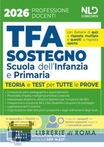 Manuale per il concorso TFA Sostegno per la scuola dell'infanzia e primaria 2026 completo di Teoria e Test per tutte le prove e quiz assegnati nei precedenti concorsi Il Manuale TFA Sostegno per la Scuola dell'Infanzia e Primaria, Teoria e Quiz, NLD Concorsi, 2026, è stato integralmente ripensato e riscritto così divenendo uno strumento di grandissima utilità nella preparazione delle prove per l'accesso al Tirocinio Formativo Attivo. Nella riscrittura del Manuale si è tenuto conto delle "materie" e degli "aspetti" più frequentemente oggetto delle prove concorsuali già svolte. Il Volume si caratterizza per una trattazione completa, aggiornata e, al contempo, schematica e fluida delle seguenti materie: Normativa riferita al sistema educativo di istruzione e di formazione e agli ordinamenti degli studi; Legislazione dell'inclusione; Conoscenze psico-pedagogiche e apprendimento; Metodologie didattiche con particolare riferimento alla didattica digitale per l' inclusione dei BES. Tra i numerosi aspetti esaminati sono stati minuziosamente approfonditi quelli più di frequente assegnati negli ultimi concorsi indetti dalle Università italiane. Tra i tanti: gli ordinamenti nella scuola; la governance della scuola; le modifiche al PEI; i Centri territoriali di supporto e per l'inclusione; lo sviluppo del linguaggio; le teorie e gli strumenti per misurare l'Intelligenza emotiva; i principali approcci pedagogici; il Cooperative Learning; gli strumenti didattici e tecnologici per l'inclusione; la disabilità e i disturbi; l'integrazione multiculturale nella scuola; la valutazione degli apprendimenti con particolare riferimento agli alunni BES, DSA e in situazioni di svantaggio. Nell'Edizione 2026 il Manuale tiene conto delle principali novità normative, tra cui quelle introdotte dal D.l. 19 febbraio2026, n. 19 c.d.Decreto PNRR (semplificazione della riforma della disabilità). Per consentire di affiancare allo studio teorico un'immediata verifica della acquisita capacità di risolvere i corrispondenti test, il Manuale include un'apposita sezione con quesiti a risposta multipla e domande a risposta aperta sulle materie trattate. Il Manuale segnala, inoltre, paragrafo per paragrafo gli argomenti già oggetto di prove assegnate nei precedenti concorsi banditi dalla Università, in tal modo richiamando l'attenzione sugli aspetti in nessun modo trascurabili nella preparazione. Completa il Volume una appendice online con i quiz ufficiali assegnati nei precedenti concorsi. Il Manuale permette, infine, l'accesso ad un'estensione online, consultabile con apposita password, per rimanere aggiornati sulle materie oggetto d'esame e per esercitarsi con il simulatore online.