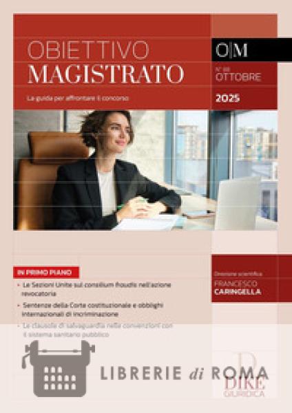 In questo numero della rivista Obiettivo Magistrato numero 88 di Ottobre 2025: Le Sezioni Unite sul consilium fraudis nell'azione revocatoria Sentenze della Corte costituzionale e obblighi internazionali di incriminazione Le clausole di salvaguardia nelle convenzioni con il sistema sanitario pubblico Ogni concorsista, all'inizio della lunga traversata del deserto che separa la laurea dall'accesso al mondo del lavoro, si è trovato di fronte alla domanda fatidica: quale rivista mi serve per superare il concorso in magistratura? Obiettivo magistrato risponde, in modo netto e preciso, a questo interrogativo. È un prodotto editoriale di nuova generazione, una rivista di scopo, concepita per fare il punto, nei mesi che separano il bando dalle prove scritte, su tutti gli argomenti che possono essere oggetto d'esame. Il progetto editoriale risponde, allora, per ognuna delle tre materie delle prove scritte, a tre bisogni fondamentali: a) la guida ragionata allo studio, attraverso l'analisi degli istituti fondamentali e attuali; b) il monitoraggio, con ricchissimi osservatori, delle sentenze più recenti e significative; c) l'apprendimento di una buona tecnica di redazione degli elaborati, con numerosi esercizi (compiti e schemi) e tracce svolte. L'avventura che attende l'aspirante magistrato è lunga e faticosa, ma anche e soprattutto appassionante. Vogliamo condurre per mano ciascun concorsista fino alle fatidiche giornate delle prove scritte, vivendo insieme questo momento, con gioia e incoscienza, non solo tramite la rivista Obiettivo Magistrato di Ottobre 2025 ma anche attraverso i libri per magistratura Dike. Direzione scientifica Francesco Caringella.