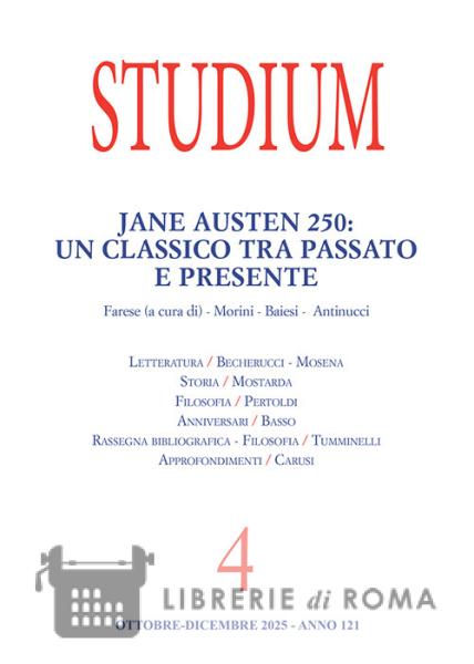 Francesco Bonini, La rivoluzione culturale dell'intelligenza artificiale Jane Austen 250: un classico tra passato e presente A cura di Carlotta Farese Carlotta Farese, Introduzione Massimiliano Morini, La traduzione come editing: una nuova versione di Sanditon, I Watson, Lady Susan Carlotta Farese, «Many thanks for your kind care for my health»: Malattia e ipocondria nella biografia e nella narrativa di Jane Austen Serena Baiesi, Sanditon: rileggere e ri-mediare l'opera incompiuta di Jane Austen da Virginia Woolf ad Andrew Davies Raffaella Antinucci, Jane Austen nell'universo transmediale: trasposizione stilistica e comunità digitale in Emma Approved (2013-2014) Letteratura Isabella Becherucci, La prima voce del Manzoni apologista Roberto Mosena, I Contraddetti di Giovanni Raboni. Un capitolo di letteratura e giornalismo Storia Matteo Mostarda, Lo sviluppo umano integrale di Paolo VI e il pensiero internazionale di Enrico Mattei, un'influenza reciproca? Filosofia Annamaria Pertoldi, Tra prossimità e lontananze. Note in margine a Edith Stein and Edmund Husserl. Philosophical Exchanges di Angela Ales Bello Anniversari Ingrid Basso, Dialogo su Søren Kierkegaard, a 170 anni dalla morte Rassegna bibliografica - filosofia Angelo Tumminelli, L'etica dell'IA da una prospettiva antropologica Approfondimenti Donato Carusi, Voci della Palestina La nostra biblioteca Tito Forcellese - Francesco Marcelli - Fausto Gianfreda S.J.