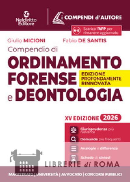 La collana I Compendi d'Autore da circa 20 anni è punto di assoluto riferimento per chi prepara gli esami universitari o le prove di abilitazione forense e dei principali concorsi pubblici. A caratterizzare la Collana sono la chiarezza nella forma, la sinteticità abbinata a completezza nella sostanza. Nell'Edizione 2026 veste grafica, struttura e contenuti sono stati profondamente rivisti per rispondere ancor più efficacemente alle esigenze di chi si prepara. Sul piano grafico, box, grassetti, elenchi puntati, rendono lo studio e la memorizzazione assai più agevoli. Numerosi i nuovi contenuti. (i) L'intera trattazione è attentamente ricalibrata tenendo conto delle domande più frequenti negli esami universitari e nelle prove dei principali concorsi pubblici. (ii) È riportata e citata in appositi Focus dottrinali la Manualistica più utilizzata nelle Università, così da assicurare una preparazione completa. (iii) Si dà inoltre atto in Box giurisprudenziali degli orientamenti interpretativi più rilevanti; (iv) Per i principali istituti, sono messe a fuoco in ulteriori Tabelle, le Analogie e le Differenze per una conoscenza sistematica della materia. Per agevolare il ripasso sono, infine, inseriti in chiusura dei capitoli due ulteriori strumenti: le Schede di sintesi, utilissime per consolidare le conoscenze acquisite; le Domande più frequenti, per saggiare la preparazione. Il Compendio di Ordinamento e Deontologia forense, suddiviso in tre parti (la prima dedicata all'Ordinamento forense, la seconda alla Deontologia forense e la terza al Procedimento disciplinare) è stato profondamente rivisto e aggiornato nell'impostazione e nei contenuti, con particolare attenzione alla disciplina dei diritti e doveri dell'Avvocato e del procedimento disciplinare. Numerosi gli spunti tratti dal più significativo dibattito sviluppatosi nella giurisprudenza di legittimità e del Consiglio Nazionale forense. Arricchisce il Volume un'utilissima Appendice normativa. Completa l'Opera un puntuale Indice analitico.