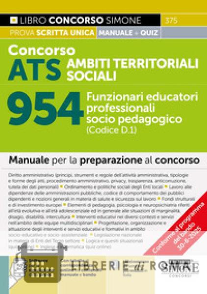 Il manuale Concorso ATS Ambiti Territoriali Sociali per 954 Funzionari Educatori professionali socio pedagogici (Codice D.1) è indirizzato alla preparazione del concorso che dà l'avvio alla procedura concorsuale per l'assunzione della figura di Funzionario Educatore socio pedagogico destinati a rafforzare gli organici degli ATS. Il presente manuale per i 954 Funzionari Educatori del Concorso ATS, in aderenza al bando, tratta le seguenti materie: Diritto amministrativo (principi, strumenti e regole dell'attività amministrativa, tipologie e forme degli atti, procedimento amministrativo, privacy, trasparenza, anticorruzione, tutela dei dati personali) Ordinamento e politiche sociali degli Enti locali Lavoro alle dipendenze delle amministrazioni pubbliche, codice di comportamento dei pubblici dipendenti e nozioni generali in materia di salute e sicurezza sul lavoro Fondi strutturali e di investimento europei Elementi di pedagogia, psicologia e neuropsichiatria riferiti all'età evolutiva e all'età adolescenziale ed in generale alle situazioni di marginalità, disagio, disabilità, intercultura Interventi educativi nei diversi contesti e servizi nell'ambito delle equipe multidisciplinari Progettazione, organizzazione e attuazione degli interventi e servizi educativi e formativi in ambito socio-educativo e socio-assistenziale Legislazione nazionale in materia di Enti del Terzo settore Logica e quesiti situazionali (quiz online) Inglese e informatica (quiz online) Sono inoltre, disponibile on line: Software per la simulazione della prova Espansioni online. Tra le espansioni è disponibile anche la tabella di corrispondenza tra contenuti del manuale e il programma del bando di concorso pubblicato il 30 giugno 2025. Anche il software verrà ulteriormente arricchito con quiz ancora più mirati sugli argomenti richiesti dal bando per il profilo.