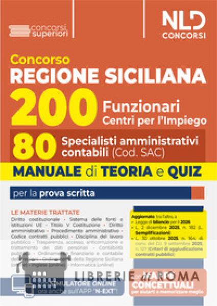 È indetto un concorso pubblico per esami, per il reclutamento di complessive n. 200 unità di personale non dirigenziale, a tempo pieno e indeterminato, con inquadramento giuridico ed economico nell'Area dei Funzionari per il potenziamento dei Centri per l'impiego della Sicilia, nei seguenti profili professionali: n. 80 Specialisti amministrativi contabili (Cod. SAC); n. 95 Specialisti mercato e servizi lavoro (Cod. SMSL); n. 25 Specialisti informatici statistici (Cod. SIST). La procedura concorsuale è affidata ad una unica prova selettiva scritta. Il Volume Concorso Regione Sicilia. 200 Funzionari, 80 Specialisti amministrativi contabili, Teoria e Quiz. NLD Concorsi 2026, è stato realizzato per venire incontro alle specifiche esigenze di chi deve affrontare la prova concorsuale. Il Volume si caratterizza per una trattazione completa, aggiornata e, al contempo, schematica e fluida delle seguenti materie: Diritto costituzionale, ivi compreso il sistema delle fonti e delle istituzioni dell'Unione europea, e regionale con particolare riferimento all'assetto delle competenze secondo il Titolo V della Costituzione; Ordinamento della Regione Siciliana; Diritto amministrativo, con particolare riferimento a procedimento amministrativo, Codice dei contratti pubblici, disciplina del lavoro pubblico, trasparenza, accesso agli atti, anticorruzione, normativa in materia di trattamento dei dati personali; Contabilità pubblica; Ordinamento finanziario e contabile delle Regioni; Lingua inglese (online); Informatica (online). Il Volume tiene conto delle più recenti novità legislative, tra cui quelle introdotte dalla L. 02 dicembre 2025, n. 182 (c.d. Legge Semplificazioni) e dalla L. 30 ottobre 2025, n. 164, di conv. del D.l. 9 settembre 2025, n. 127 (Criteri di aggiudicazione dei contratti pubblici). Ulteriori aggiornamenti alle più importanti leggi approvate dopo la pubblicazione del Volume saranno resi disponibili online. Per consentire di affiancare allo studio teorico una immediata verifica della acquisita capacità di risolvere i corrispondenti test, il Manuale presenta quiz di verifica suddivisi per ciascuna Parte o per singoli Capitoli che compongono le indicate materie. Il Manuale Regione Siciliana. 200 Funzionari, 80 Specialisti amministrativi contabili, Teoria e Quiz. NLD Concorsi 2026, permette, infine, l'accesso ad un'estensione online, consultabile con apposita password, per rimanere aggiornati sulle materie oggetto d'esame, per accedere alle mappe concettuali e per esercitarsi con il simulatore online.