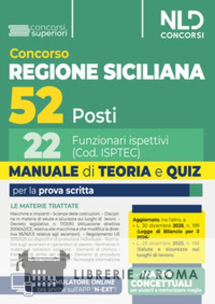 È indetto un concorso pubblico, per esami, per il reclutamento di complessive n. 52 unità di personale non dirigenziale, a tempo pieno e indeterminato, con inquadramento giuridico ed economico nell'Area dei Funzionari da assegnare presso gli Uffici dell'Ispettorato Territoriale del Lavoro, di cui: n. 30 Ispettori del Lavoro (Cod. ISPAM); n. 22 Funzionari ispettivi-vigilanza tecnica salute e sicurezza sul lavoro (Cod. ISPTEC). La procedura concorsuale è affidata ad una unica prova selettiva scritta. Il Volume Regione Siciliana. 52 Funzionari, 22 Funzionari ispettivi (Cod. ISPTEC), Teoria e Quiz. NLD Concorsi 2026, è stato realizzato per venire incontro alle specifiche esigenze di chi deve affrontare la prova concorsuale. Il Volume si caratterizza per una trattazione completa, aggiornata e, al contempo, schematica e fluida delle seguenti materie: Macchine e impianti; Scienza delle costruzioni; Disciplina in materia di salute e sicurezza sui luoghi di lavoro; Decreto legislativo n. 17/2010 (Attuazione direttiva 2006/42/CE, relativa alle macchine e che modifica la direttiva 95/16/CE relativa agli ascensori); Regolamento UE 2016/425 sui dispositivi di protezione individuale; Normativa sugli ascensori e i generatori di vapore; Normativa in materia di radiazioni ionizzanti; Elementi di chimica; Elementi di diritto del lavoro; Elementi di procedura penale; Lingua inglese (online); Tecnologie informatiche (online). Il Volume tiene conto delle più recenti novità legislative, tra cui quelle introdotte dalla L. 30 dicembre 2025, n. 199 (Legge di Bilancio per il 2026), dalla L. 29 dicembre 2025, n. 198 (Salute e sicurezza sui luoghi di lavoro) e dalla L. 2 dicembre 2025, n. 181 (Femminicidio). Per consentire di affiancare allo studio teorico una immediata verifica della acquisita capacità di risolvere i corrispondenti test, il Manuale presenta quiz di verifica suddivisi per ciascuna Parte e per singoli Capitoli che compongono le indicate materie. Il Manuale 52 Funzionari, 22 Funzionari ispettivi (Cod. ISPTEC), Teoria e Quiz. NLD Concorsi 2026, permette, infine, l'accesso ad un'estensione online, consultabile con apposita password, per rimanere aggiornati sulle materie oggetto d'esame, per accedere alle mappe concettuali e per esercitarsi con il simulatore online. Abbina al Manuale il corso online simulazioni e correzioni personalizzate, per una preparazione ancora più efficace.