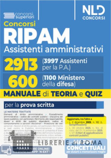 Sono stati indetti due importanti concorsi pubblici Ripam su base territoriale, per titoli ed esami, per il reclutamento di un contingente complessivo di: n. 3.997 unità di personale non dirigenziale, a tempo pieno e indeterminato, da inquadrare nei ruoli di diverse Amministrazioni, nell'Area degli assistenti, di cui n. 2913 Assistenti amministrativi; n. 1100 unità di personale non dirigenziale, a tempo pieno e indeterminato, da inquadrare nei ruoli del Ministero della difesa, nell'Area degli assistenti, di cui n. 600 Assistenti amministrativi. La prova scritta per i profili Assistenti Amministrativi dei due Concorsi Ripam (2913 per le P.A.) e 600 (per il Ministero Difesa) verte su materie identiche, eccettuata quella dell'Ordinamento delle Amministrazioni. Questa è infatti riferita a "diverse Amministrazioni" nel Concorso relativo a 2913 (3997 per le Pa) e al solo "Ministero della difesa" in quello per 600 (1100 Ministero Difesa). Il Manuale è stato quindi pensato per chi deve prepararsi ad affrontare la prova scritta dell'uno o dell'altro concorso ovvero per chi intende sostenerli entrambi. Esamina in modo completo, infatti, tutte le materie identiche e, distintamente, l'Ordinamento delle Amministrazioni (per 2913) e l'Ordinamento del Ministero della difesa" (per 600). Il Volume si caratterizza per una trattazione completa, aggiornata e, al contempo, schematica e fluida delle seguenti materie: Elementi di diritto amministrativo, anche con riferimento al procedimento amministrativo, al codice dei contratti pubblici e alla protezione dei dati personali; Norme generali in materia di pubblico impiego, con particolare riferimento alle responsabilità, doveri e diritti dei pubblici dipendenti, codice di comportamento e sanzioni disciplinari; Nozioni di diritto penale, con particolare riferimento ai reati contro la Pubblica Amministrazione; Codice dell'Amministrazione digitale; Elementi di contabilità di Stato e degli enti pubblici; Elementi di diritto dell'Unione Europea; Capacità logico-deduttiva e di ragionamento critico-verbale; Quesiti situazionali; Ordinamento delle amministrazioni e del Ministero della Difesa (online); Lingua inglese (online); Conoscenza e uso delle tecnologie informatiche (online). Il Volume è aggiornato alle più recenti novità legislative, tra cui la L. 2 dicembre 2025, n. 182 (L. Semplificazioni) e la L. 30 ottobre 2025, n. 164, di conv. del D.l. 9 settembre 2025, n. 127 (Criteri di aggiudicazione contratti pubblici). Per consentire di affiancare allo studio teorico una immediata verifica della acquisita capacità di risolvere i corrispondenti test, il Manuale presenta quiz di verifica online suddivisi per ciascuna Parte o per singoli Capitoli. Il Volume permette, infine, l'accesso ad un'estensione online consultabile con apposita password per rimanere sempre aggiornati sulle materie trattate e per accedere al simulatore online. Abbina al Manuale il Corso avanzato online Lezioni, simulazioni e correzioni personalizzate, per una preparazione ancora più efficace.