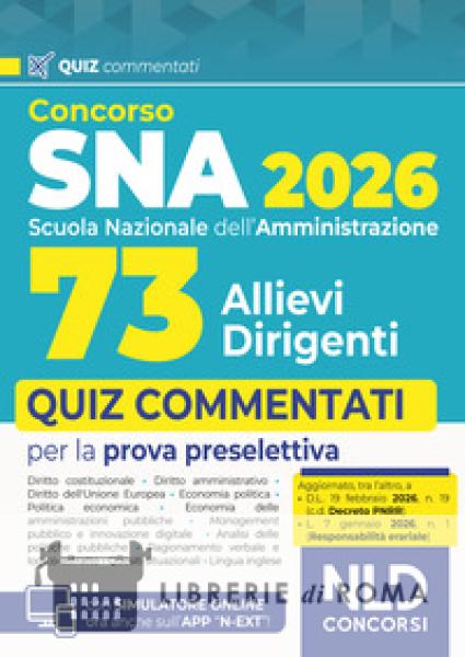 La Scuola Nazionale dell'Amministrazione ha indetto un concorso pubblico, per esami, per l'ammissione di n. 73 allievi al corso - concorso selettivo di formazione dirigenziale per il reclutamento di n. 61 dirigenti nelle amministrazioni statali, anche a ordinamento autonomo, e negli enti pubblici non economici. La procedura concorsuale è articolata in una eventuale prova di preselezione, tre prove scritte ed una orale. Il Volume Concorso SNA. 73 Allievi dirigenti. Quiz commentati, NLD Concorsi, 2026 viene incontro alle specifiche esigenze di chi deve prepararsi ad affrontare tutte le prove concorsuali. Il Volume contiene, infatti, quiz con soluzioni commentati sulle seguenti materie: Diritto costituzionale; Diritto amministrativo; Diritto dell'Unione Europea; Economia politica; Politica economica; Economia delle amministrazioni pubbliche; Management pubblico e innovazione digitale; Analisi delle politiche pubbliche; Ragionamento verbale e logico-astratto; Quesiti situazionali; Lingua inglese. Il Volume tiene conto delle più recenti novità normative, tra cui il D.L. 19 febbraio 2026, n. 19 (c.d. Decreto PNRR) e la L. 07 gennaio 2026, n. 1 (Riforma della Corte dei Conti e della Responsabilità erariale). I quiz, con soluzioni guidate e commentate, sono per lo più suddivisi per ciascuno dei capitoli di cui si compone il corrispondente Manuale Concorso SNA. 73 Allievi dirigenti. Teoria e quiz, NLD Concorsi, 2026 in modo da consentire di affiancare, allo studio teorico, un mirato esercizio pratico. Il Volume permette, infine, l'accesso ad un'estensione online, consultabile con apposita password, per rimanere aggiornati sulle materie oggetto d'esame e per esercitarsi con il simulatore online. Per una completa trattazione delle materie concorsuali si consiglia il Manuale Manuale Concorso SNA. 73 Allievi dirigenti. Teoria e quiz, NLD Concorsi, 2026.