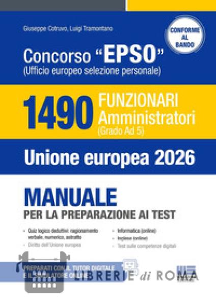 Strumento di preparazione alle 4 prove a test del bando di Concorso EPSO Unione Europea 2026 per 1490 Funzionari Amministratori (Grado AD 5), il volume presenta nella prima parte una raccolta di quiz di logica, suddivisa nelle seguenti tipologie: Ragionamento numerico; Ragionamento verbale; Ragionamento astratto. Nella seconda parte: Diritto dell'Unione Europea; Competenze digitali; Informatica e Inglese (online). Ogni capitolo contiene un'introduzione iniziale con indicazioni pratiche sulla tipologia di quiz e su come affrontarli e risolverli. Ogni quiz contiene una risposta commentata per chiarire il procedimento e arrivare alla giusta risoluzione. La terza parte approfondisce i principali temi di Diritto dell'Unione Europea. L'ultima parte, dedicata alle Competenze digitali, ne riporta il quadro completo oltre ad una selezione di test utili a verificare la preparazione. Nella sezione online collegata al volume, accessibile seguendo le istruzioni riportate in fondo al testo, sono disponibili: Inglese; Informatica; Simulatore di quiz; Tutor digitale anche per la prova EUFTE.