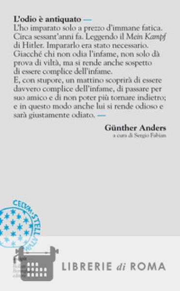 In questo saggio Gunther Anders prosegue nella sua riflessione sull'obsolescenza delle emozioni e dei sentimenti, inutili fardelli in un mondo dominato dallo strapotere delle macchine. La Tecnica ha reso l'uomo antiquato, obbligandolo nello stretto binario della coppia produzione-consumo, e antiquata è divenuta anche la sua attitudine immaginativa, ormai incapace di cogliere gli smisurati effetti di gesti che rischiano di avere nel paradosso atomico, nell'evento ultimo la loro epifania onnidistruttiva. In un universo moralmente imploso, l'odio e diventato un sovrappiù per occasioni speciali, un'inutile via traversa, cosi come i campi di battaglia resi obsoleti dal gesto asettico e ripetitivo del disinseritore che annichilisce da lontano. L'intransigenza e l'esagerazione come metodo ermeneutico, sono la cifra di questo saggio andersiano che nella sua radicalità getta squarci di luce sul nostro tempo e sulle sue scandalose aporie.