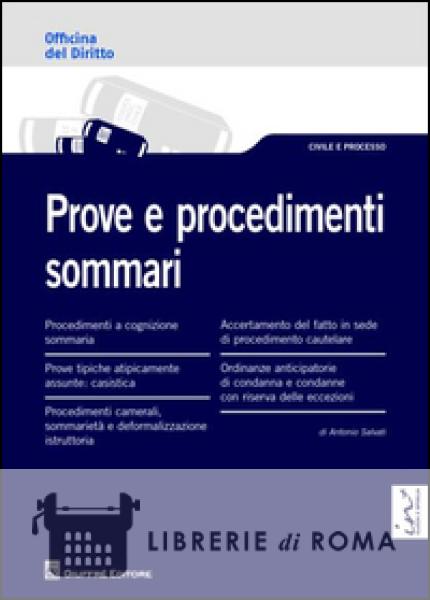 Officina del diritto: è uno strumento di lavoro e di studio pensato per arricchire le proprie conoscenze giuridiche attraverso un sistema di lettura strutturato su più livelli: uno più immediato che consente di focalizzare i concetti "guida" di una precisa fattispecie giuridica con l'utilizzo di esempi, tavole sinottiche, schemi, formule, quesiti, mappe giurisprudenziali, e un altro più approfondito che illustra organicamente la materia e nel quale si rinvengono informazioni puntuali e chiarimenti mirati di pronta fruibilità. L'opera "Prove e procedimenti sommari" affronta le seguenti tematiche: Procedimenti a cognizione sommaria; Prove tipiche atipicamente assunte: casistica; Procedimenti camerali, sommarietà e deformalizzazione istruttoria; Accertamento del fatto in sede di procedimento cautelare; Ordinanze anticipatorie di condanna e condanne con riserva delle eccezioni.