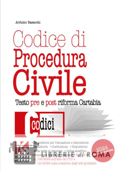 Al testo del codice di procedura civile 2024 seguono le disposizioni di attuazione, le preleggi, la Costituzione italiana e un ampio e dettagliato indice analitico-alfabetico. Con il testo pre e post riforma Cartabia - decreto legislativo 10 ottobre 2022, n. 142 - per orientarsi meglio nel processo. E con i decreti ministeriali n. 109/2023 sull'albo dei Consulenti Tecnici di Ufficio e n. 110/2023 sulle modalità di redazione degli atti giudiziari. Le fonti delle abrogazioni, modificazioni, sostituzioni, inserimenti, aggiunte, rinvii nonché le pronunzie della Corte costituzionale sono riportate in calce agli articoli unitamente alla evoluzione storica della normativa. Aggiornato agli interventi legislativi e alle pronunzie costituzionali. Il codice di procedura civile Kollesis è un sussidio per studenti, concorsisti, avvocati, magistrati, giuristi, tirocinanti e altri operatori del diritto. Consultabile durante qualsiasi prova di esame o concorso, i testi delle norme non sono commentati. Stampato con carattere tipografico ad alta leggibilità.