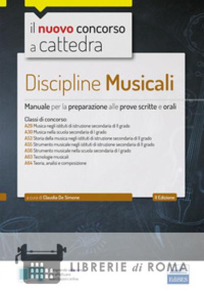 Il presente volume si pone come utile strumento di studio per quanti si apprestano alla preparazione al concorso a cattedra per le classi il cui programma d'esame comprende le Discipline Musicali. Il manuale è strutturato in parti. La prima parte tratta gli aspetti ordinamentali correlati all'insegnamento della musica. La seconda parte sintetizza in modo efficace la storia della musica dagli antichi greci agli ultimi anni del Novecento. La terza parte è dedicata alle competenze specifiche del docente di discipline musicali. La quarta parte offre spunti operativi e contiene suggerimenti utili su come impostare le lezioni in classe. La quinta parte sintetizza i tratti salienti della fisica del suono, in particolare gli aspetti fisici e musicali dell'acustica. L'ultima parte del testo è infine incentrata sulla pratica dell'attività d'aula e contiene esempi di Unità di Apprendimento utilizzabili come modello per una didattica metacognitiva e partecipativa. Chiude il volume una sintetica Appendice normativa relativa al settore artistico-musicale. Il testo è completato da un software di simulazione per la verifica delle conoscenze acquisite e da eventuali aggiornamenti online.