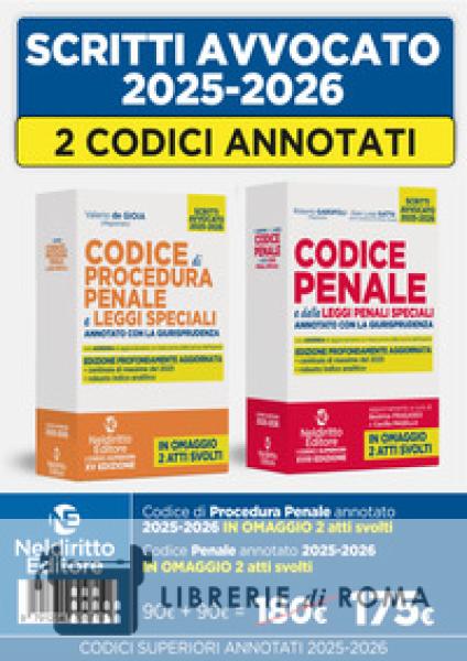 Anche nella sessione 2025-2026 è prevista, per l'esame di Stato per l'abilitazione alla professione di avvocato, la prova scritta, consistente nella redazione di un atto giudiziario. La prova orale, invece, sarà articolata in più fasi di cui la prima consiste nella soluzione di un caso. Sono destinati a essere nuovamente decisivi, pertanto, i Codici annotati, in specie quelli che garantiscono, completezza, aggiornamento, rapidità nella consultazione e nella ricerca delle massime pertinenti. I Codici Superiori annotati con giurisprudenza, Neldiritto Editore 2025 - da circa 20 anni diffusamente utilizzati da professionisti e aspiranti avvocati - sono il risultato dell'impegno profuso da giuristi autorevoli. Nelle Edizioni 2025-2026, i Codici, oltre che aggiornatissimi, sono profondamente ripensati, riorganizzati, arricchiti. Particolare impegno, anche in questa Edizione 2025-2026, è stato profuso nell'assicurare: l'aggiornamento dell'apparato normativo, la completezza e ricchezza delle questioni giurisprudenziali segnalate, la chiarezza delle massime riportate; la logicità dei sommari sotto le singole disposizioni, organizzati in modo da consentire l'agevole individuazione dei profili esaminati e l'intuitiva ricostruzione dei percorsi logici sottesi; la struttura grafica che favorisce un'agevole consultazione, anche grazie ad un uso sapiente della tecnica del grassetto; la particolare visibilità delle decisioni più recenti e di quelle degli organi nomofilattici; il puntuale aggiornamento alla giurisprudenza più recente, anche di merito. In questa Edizione sono state inserite numerosissime massime riferite alla giurisprudenza, anche europea, del 2025. È stato, infine, arricchito l'indice analitico. Tanto per il professionista quanto per chi deve sostenere le prove dell'esame di abilitazione forense è fondamentale poter individuare tempestivamente le massime che affrontano gli aspetti di diritto decisivi per la soluzione del caso. In questa prospettiva, l'indice è composto da migliaia di voci di cui numerose (distintamente evidenziate) che rinviano alle norme per le quali è intervenuta la giurisprudenza del 2025 e degli anni precedenti.