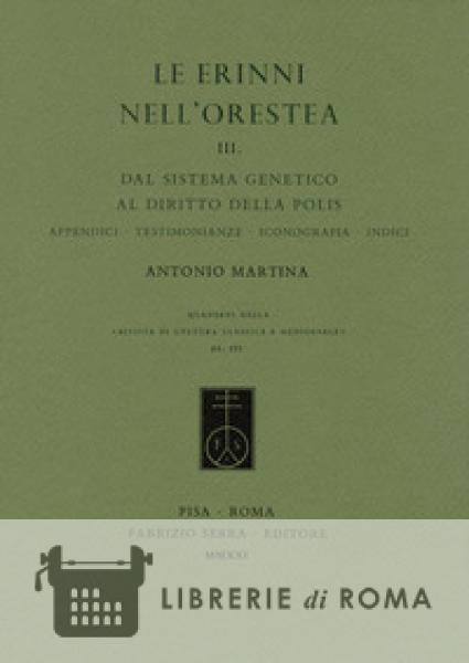 Il terzo volume de "Le Erinni nell'Orestea" è posto a suggello dell'intera opera dedicata alla tragedia eschilea. Antonio Martina, ripercorrendo dettagliatamente le varie fasi del processo di Oreste di fronte all'Areopago, esamina il significato dell'assoluzione del matricida, pone l'attenzione sul ruolo della Corte ateniese prima e dopo la riforma di Efialte e conclude con una densa riflessione sull'integrazione delle Erinni nell'ordine cosmico di Zeus e nella giustizia della città, che sancisce il fondamentale passaggio Dal sistema genetico al diritto della polis, messo in evidenza anche nel sottotitolo del volume. La seconda parte del libro è costituita da un considerevole apparato testuale che correda l'intera trilogia: cinque articoli già editi, una raccolta di fonti letterarie e iconografiche, una serie di tabelle che riguardano gli epiteti delle Erinni e delle divinità ad esse associate.