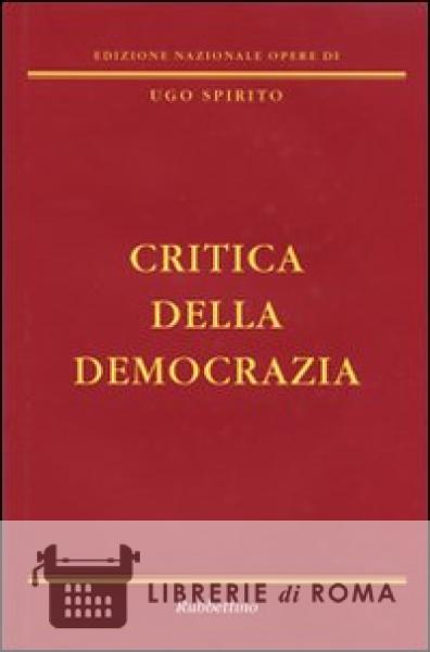Apparsa nel 1963, "Critica della democrazia" è, fra le opere di Spirito, una delle più significative. Il lavoro concepito all'inizio del 1962, uscì in un momento nel quale il dibattito teorico sulla democrazia era molto vivace e nel quale l'attenzione dello studioso era stata colpita dal suo incontro de visu con l'esperienza concreta del comunismo russo e del comunismo cinese. Dal punto di vista filosofico il volume approfondiva e portava avanti le tesi già enunciate in un precedente lavoro pubblicato due anni prima, "Inizio di una nuova epoca", che aveva aperto una fase nuova del pensiero di Spirito, tutta fondata sulla fiducia nella scienza, in una scienza intesa in un significato più ampio, che la portava a investire di sé tutti gli aspetti e i problemi della realtà e ad estendersi a tutti i campi dello scibile. Il volume propone una lettura interpretativa del fascismo alla luce delle vicende dell'attualismo e suggerisce, in un tal modo, la possibilità di un approccio in chiave culturale e filosofica allo studio di quel periodo storico. Il 1932, l'anno cioè del convegno di studi sindacali e corporativi di Ferrara, viene presentato come un momento fondamentale. Spirito accredita l'idea che, in quella sede e in quella occasione, sarebbe esplosa la "tesi comunista" con la negazione della proprietà individuale e la proposta dell'istituto della "corporazione proprietaria".