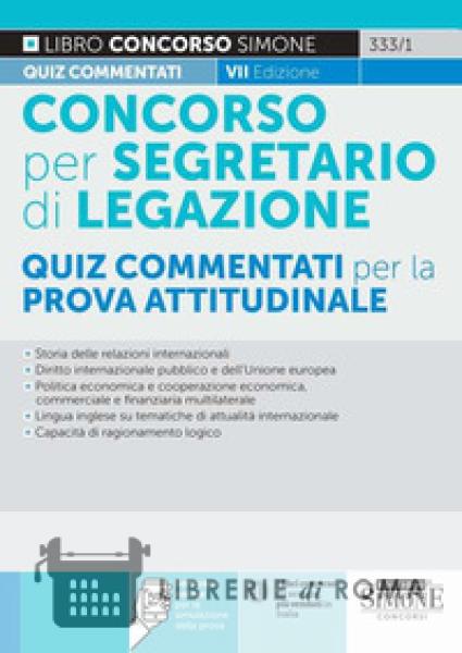 Il manuale Concorso per Segretario di Legazione - Quiz Commentati è diretto alla preparazione della prova attitudinale del concorso, per titoli ed esami, bandito periodicamente dal Ministero degli Affari Esteri e della Cooperazione Internazionale (MAECI) per l'accesso alla carriera diplomatica. La prova attitudinale consiste in 60 quiz a risposta multipla riguardanti: Storia delle relazioni internazionali a partire dal congresso di Vienna; Diritto internazionale pubblico e dell'Unione europea; Politica economica e cooperazione economica, commerciale e finanziaria multilaterale; Lingua inglese, senza l'uso di alcun dizionario, su tematiche di attualità internazionale; Test per l'accertamento della capacità di ragionamento logico. Il testo contiene quiz commentati su tutte le suddette materie e, inoltre, dedica un'intera parte all'esplicazione di quesiti ufficiali. Grazie al software online è possibile esercitarsi in infinite simulazioni della prova d'esame.