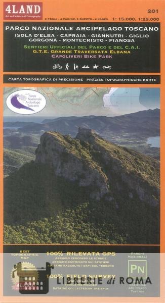 Cartografia ufficiale del Parco Nazionale Arcipelago Toscano realizzata in collaborazione con il Parco e con il CAI. Tutti i sentieri ufficiali del Parco, del CAI, tutti i punti d'interesse, le aree protette a terra e a mare, le informazioni culturali e logistiche e le spiagge. È adatta per chi pratica escursionismo, mountain bike, e passeggiate a cavallo. Cofanetto di due carte, una con l'Isola d'Elba a scala 1:25.000, l'altra con le singole isole a scala 1:15.000. Stampata su Polyart, materiale impermeabile, anti-strappo e riciclabile.